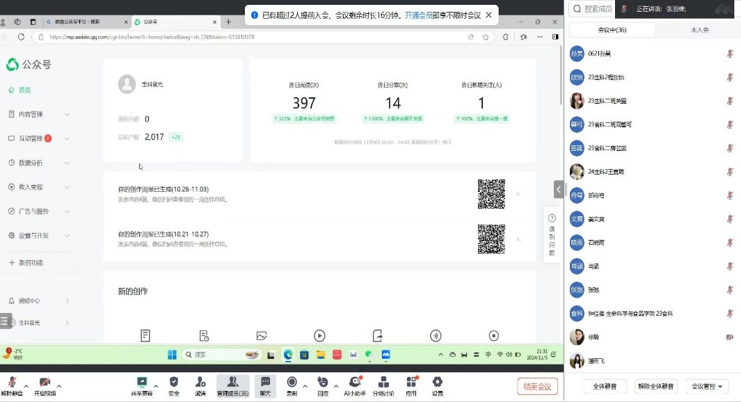 最后新媒体工作室召开了线上培训。负责人对新成员的加入表示欢迎的同时详细讲解了新闻、推送的相关类别,素材采集的具体要求及推送的具体操作方法。