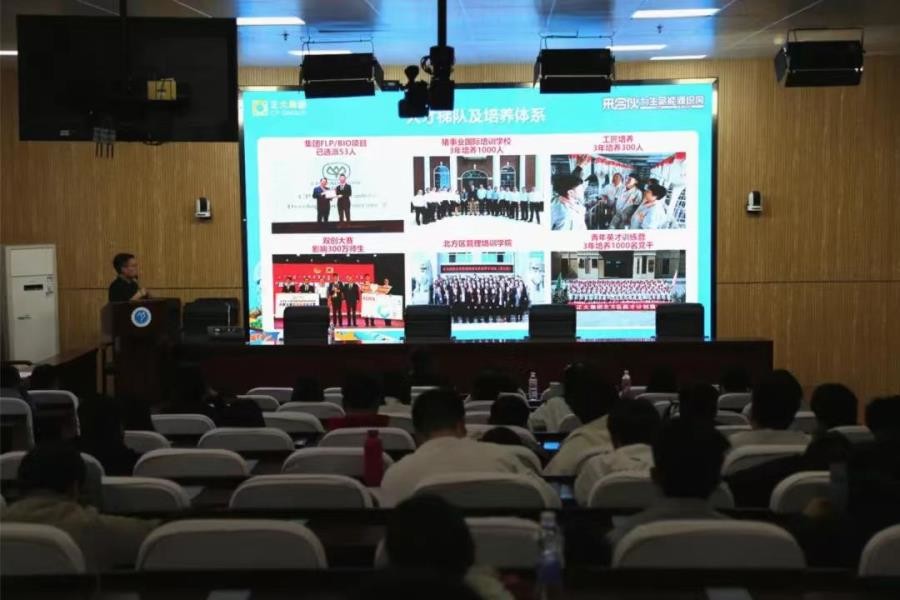 饲料事业人力资源部经理于博丞向大家细致地讲解了公司的优厚待遇以及在职学历提升等政策,鼓励学生们选择适合自己的职业,规划自己的人生。